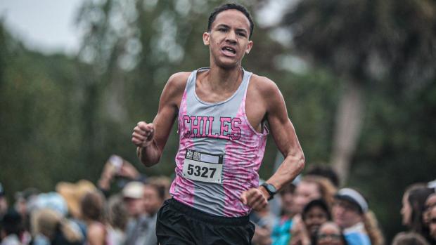 He got a little help from Chiles HS senior Joshua Hicks, who pushed Mantecon early in the race and stayed within contact through the first mile. Hicks went on to finish second, running a 14:57, to become one of only eight boys who have run sub-15 on the New World Course.
