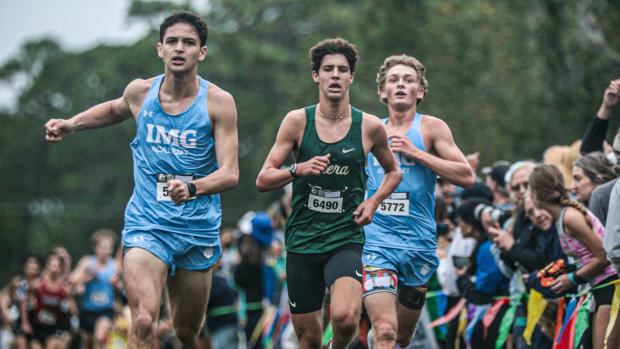Senior Pedro Ferreira de Abreu (left) and junior James Pfuhl of IMG with senior Michael Girard of Viera HS at the finish. Girard was 13th (15:26), Ferriera de Abreu 14th (15:27), and Pfulh 15th (15:28).