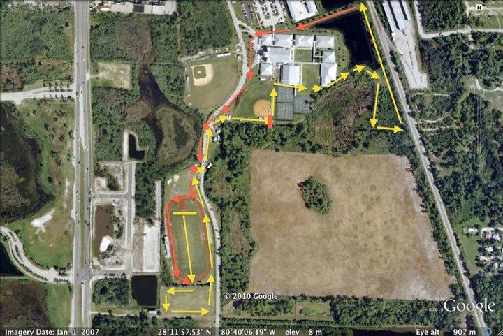 Map Explaination: Yellow= First Mile Red= Second Mile When you come on the track after the second loop of the course you will go 350 meters around and finish at the 200 meter mark of the track.